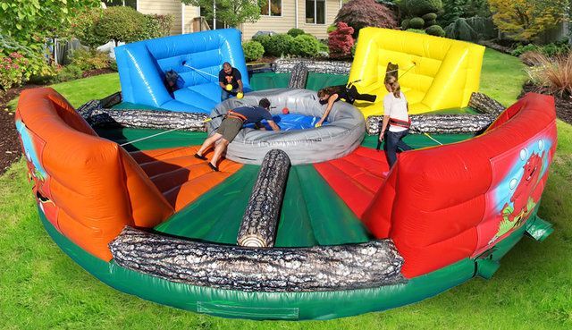 6. Hippo Chow Down Interactive Inflatable: The goal of the game is for players to grab as many balls as they can and place them in their designated bag while being strapped to a bungee cord.